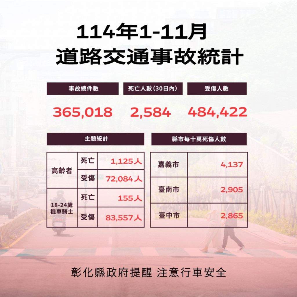 六、 附件為「114年1-11月全國道路交通事故統計、彰化縣交通事故死傷人數增加排行、本縣各鄉鎮市30日死亡人數、肇事熱點及交通事故肇因統計」共5份統計資料宣導圖,社群宣導內容可參閱或分享本處「花現彰化-彰化縣政府新聞處」(https://pse.is/8qxh9f)臉書粉絲專頁。