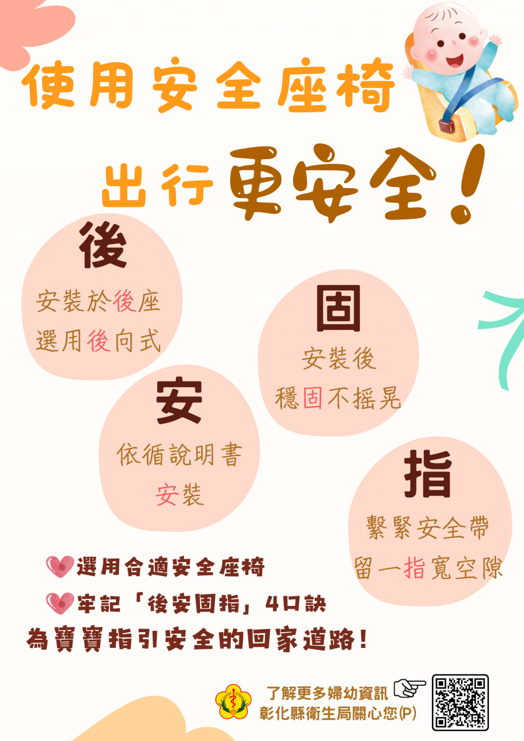 (二) 兒童使用安全座椅四口訣:後、安、固、指。彰化縣衛生局關心您!