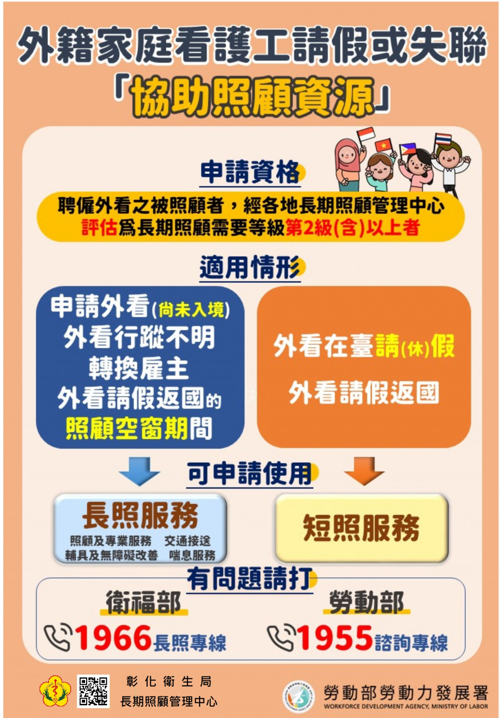 (十一)聘有外籍看護工家庭於移工健檢或請假時,申請短期替代照顧服務幫助您,有需求請撥(04)7278503或長照專線1966,彰化縣衛生局關心您!