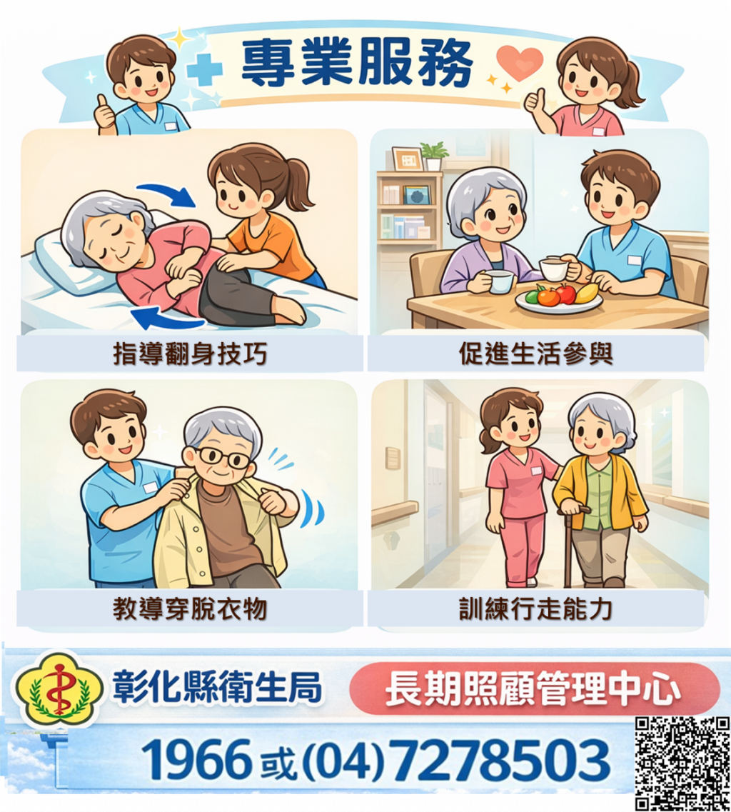 (十二)長照2.0-專業服務,透過醫事人員短期密集性介入服務,提升長照個案參與自我照顧能力或家屬學習照顧技巧,讓長照服務盡早介入,有助於減輕照顧負擔。如有需求請撥(04)7278503或長照專線1966,彰化縣衛生局關心您!