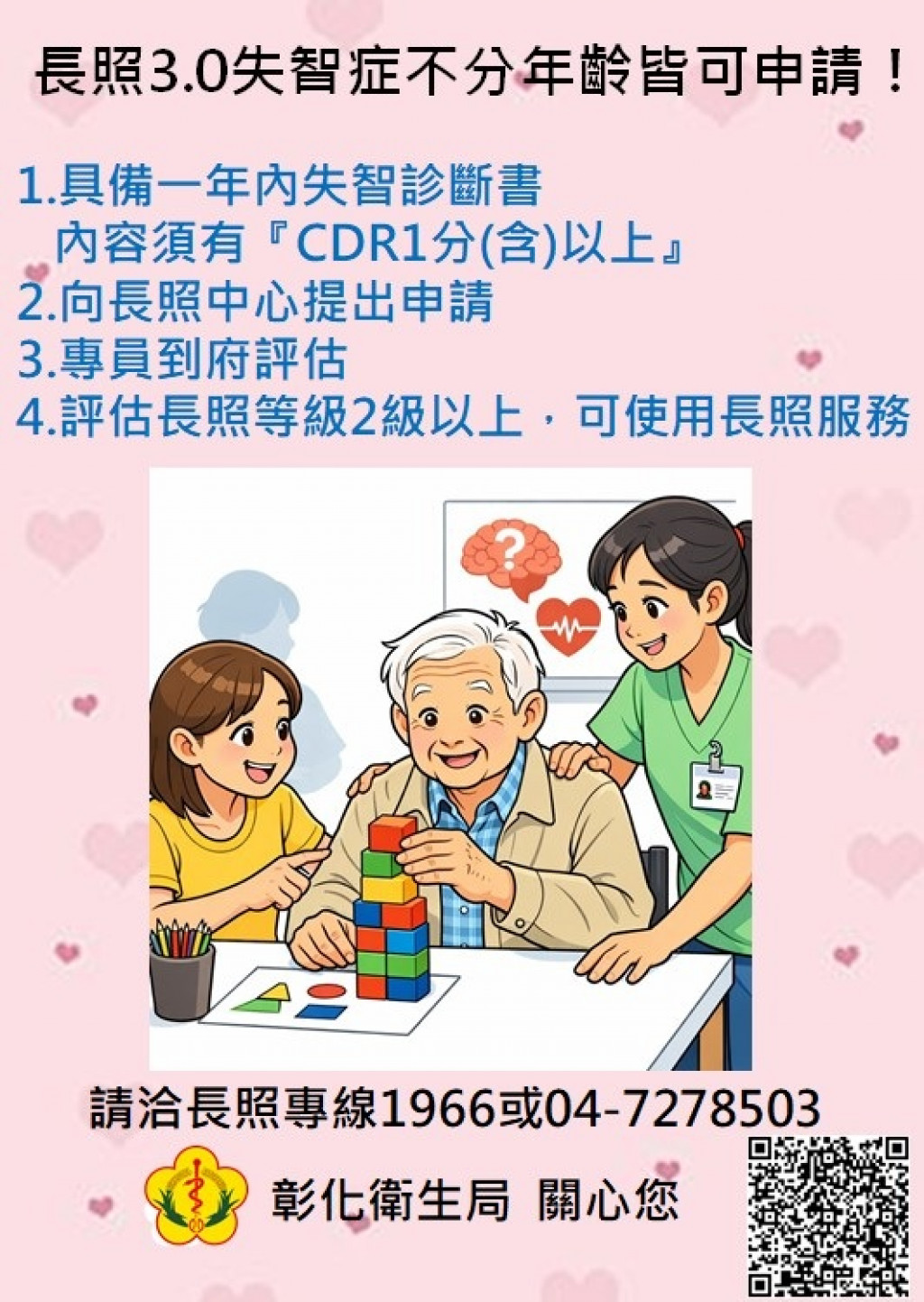 (十三)長照3.0服務對象擴大,失智症不分年齡皆能提出申請,有需求者,請洽長照專線1966或04-7278503!彰化縣衛生局關心您!