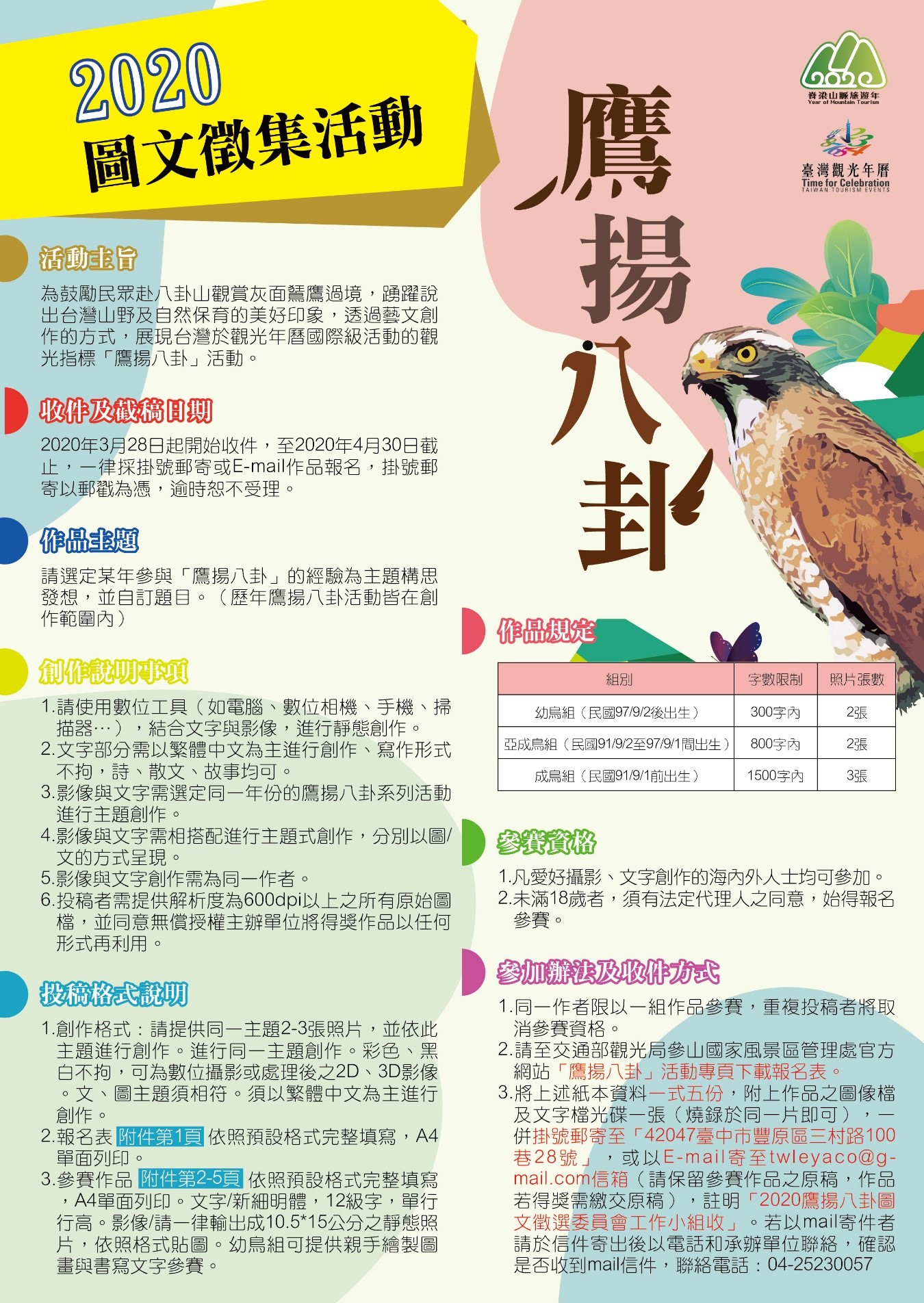 四、檢附活動辦法(含報名表)與宣傳DM供參。中、專科學生),可報名亞成鳥組,投稿字數限制800字內,需提供切合創作主題之照片2張。
